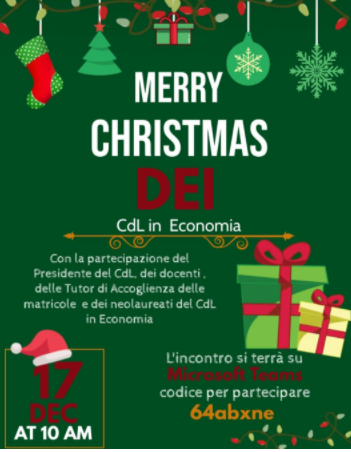 Le Tutor dell'accoglienza del CdL di Economia invitano le matricole e tutti gli studenti del Corso di laurea di Economia agli Auguri di Natale che avranno luogo giovedì 17 dicembre dalle 10,00 alle 11,00 su Teams (codice 64abxne). All'incontro parteciperanno il direttore del Dipartimento, il presidente del CdL, i docenti e i rappresentanti degli studenti.