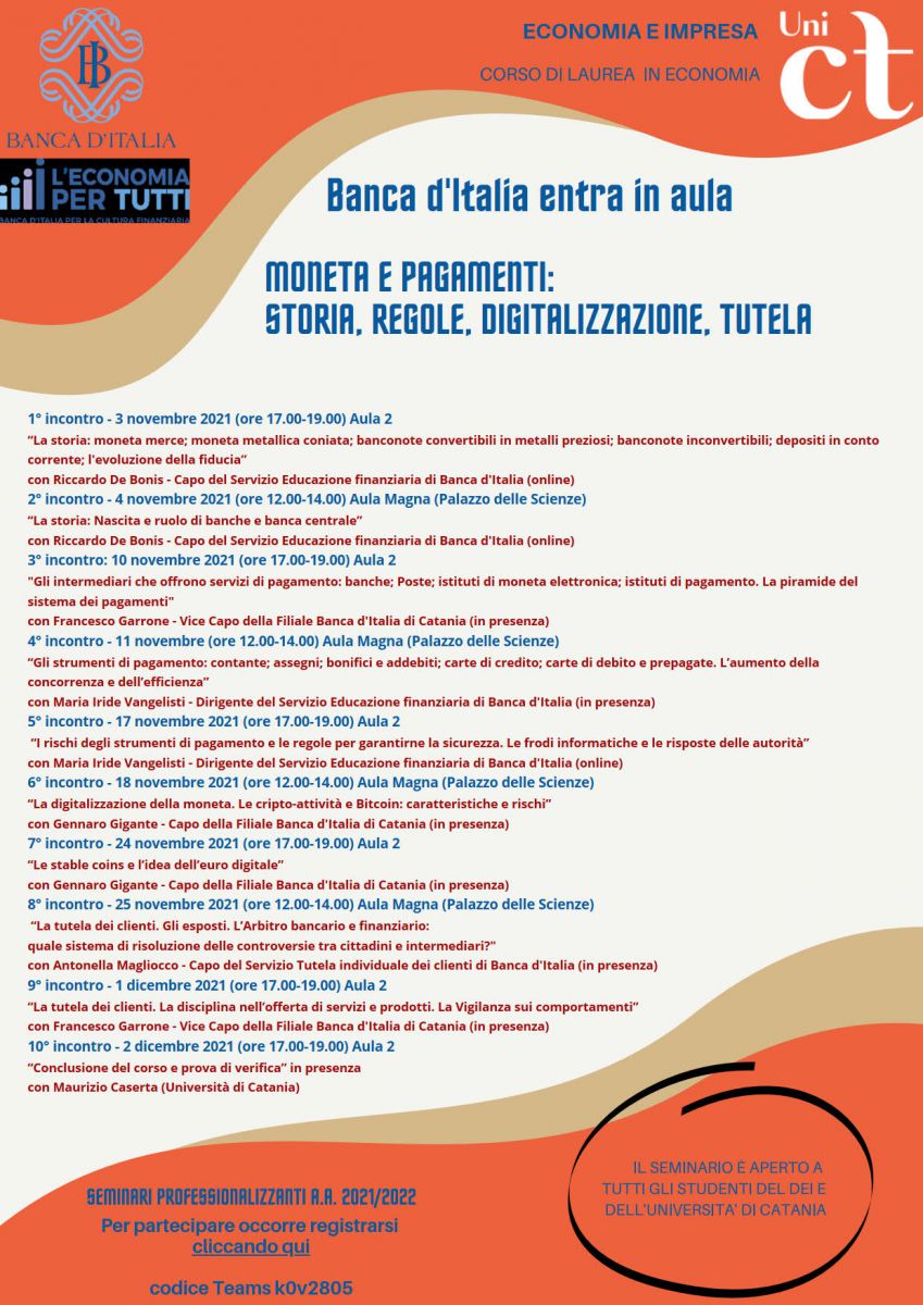 Il corso di laurea di Economia del Dipartimento di Economia e Impresa (DEI), in collaborazione con Banca d'Italia, organizza il ciclo di seminari " Banca d'Italia entra in aula - Moneta e pagamenti, Storia, regole, digitalizzazione, tutela ". Gli incontri, previsti come seminari professionalizzanti per gli studenti dei corsi di studio del DEI, sono aperti a tutti gli studenti dell'Università di Catania interessati ad approfondire le caratteristiche e le sfide che l'innovazione digitale implica nel sistema dei pagamenti. Gli incontri si terranno presso la sede del DEI.