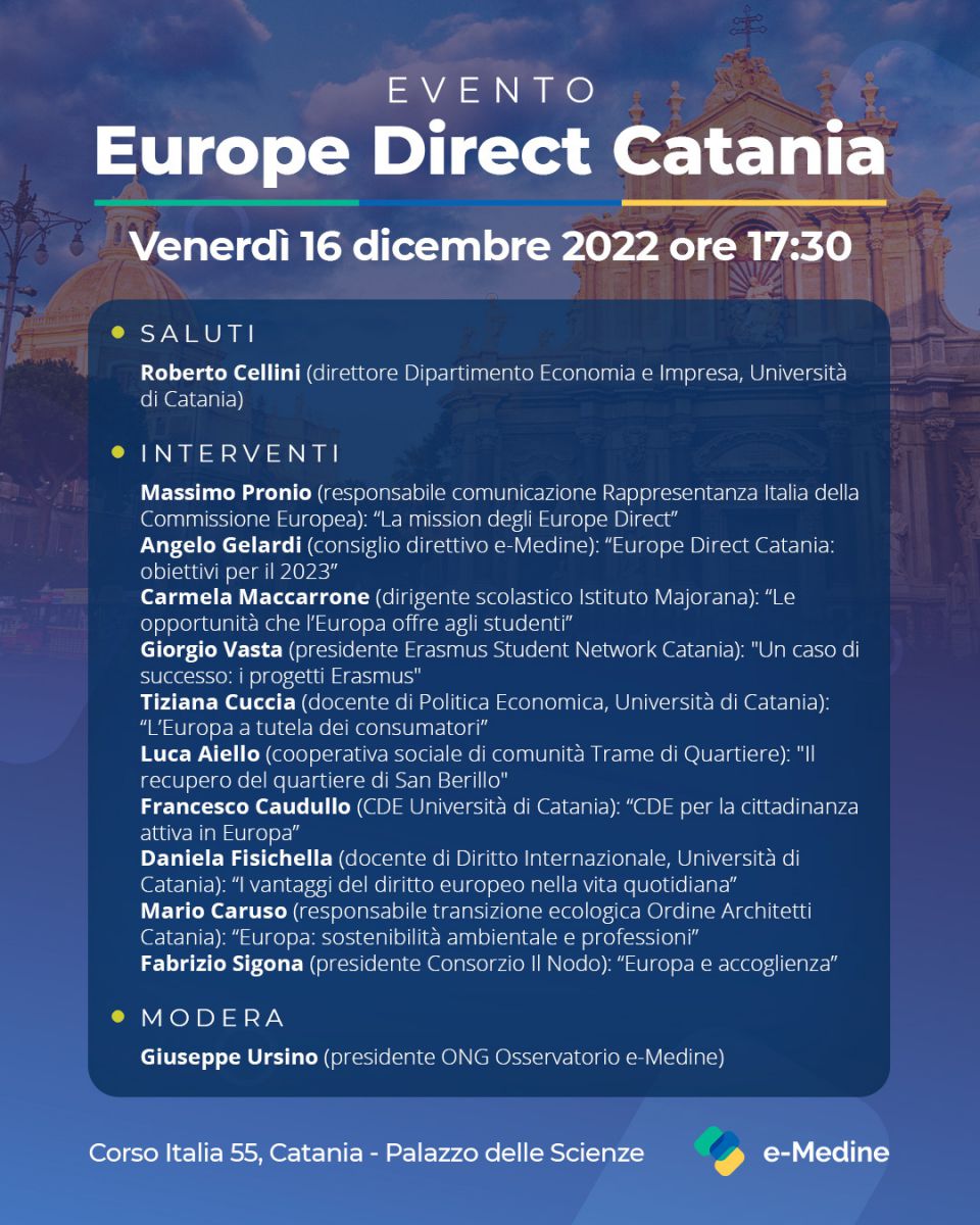 Venerdì 16 dicembre 2022 alle ore 17.30 si terrà l'evento "Europe Direct Catania".