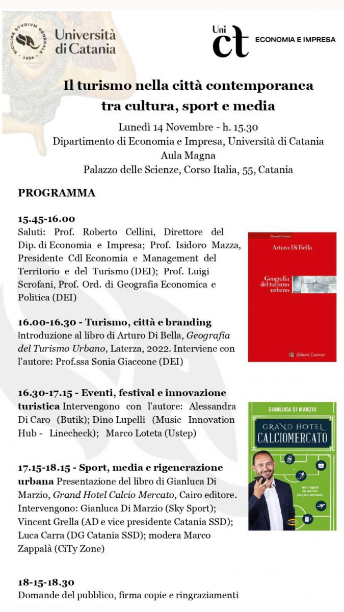 Lunedì 14 novembre dalle ore 15.45 presso l’Aula Magna del Dip. Economia e Impresa si terrà la giornata di studi dal titolo "Il turismo nella città contemporanea tra cultura, sport e media”, in cui è prevista la presentazione del libro di Arturo Di Bella, Geografia del turismo urbano, Laterza, Bari-Roma, 2022, insieme a vari ospiti tra cui, il noto giornalista di Sky Sport Gianluca Di Marzio e alcuni rappresentanti della nuova società calcistica Catania SSD.
