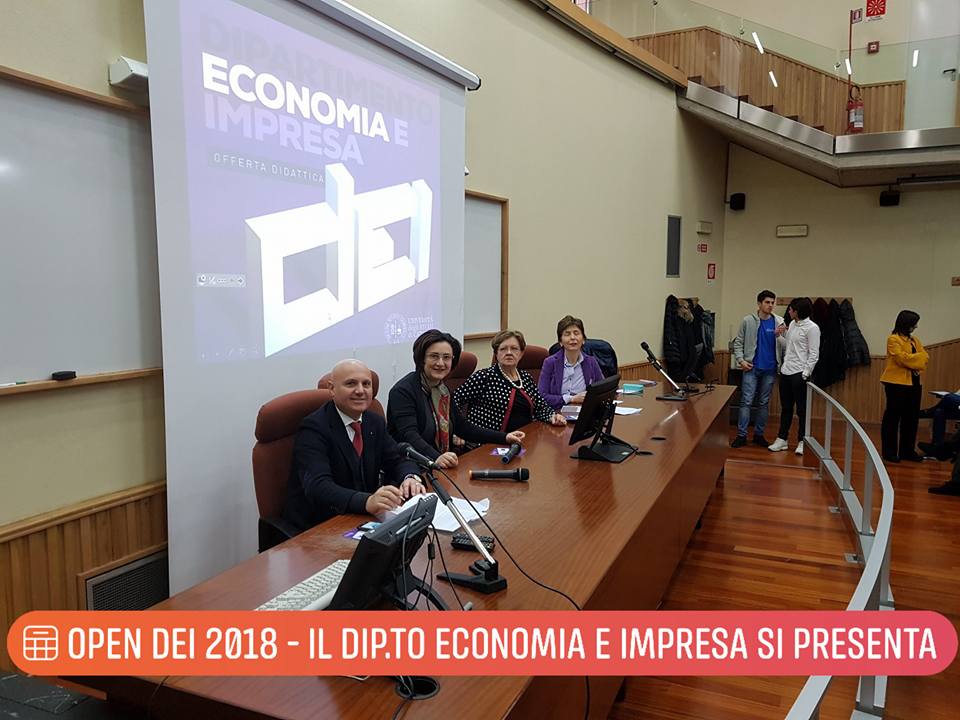 Nel corso della manifestazione, il Direttore, i Presidenti dei Corsi di Laurea e i docenti del DEI, hanno illustrato i piani di studio dei Corsi di Laurea in Economia e in Economia Aziendale, hanno fornito le informazioni necessarie relative alla prova di ammissione ai Corsi e hanno presentato la sede e le strutture del DEI.