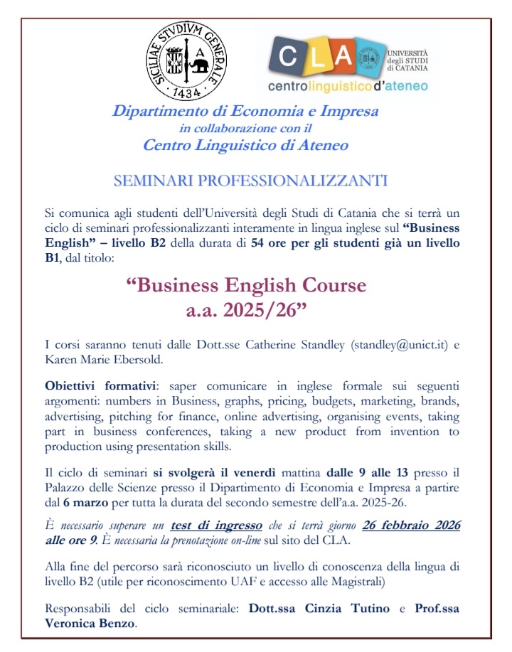Si informano gli studenti del Dipartimento che è in programma l'edizione 2025/2026 del "Business English Course".
