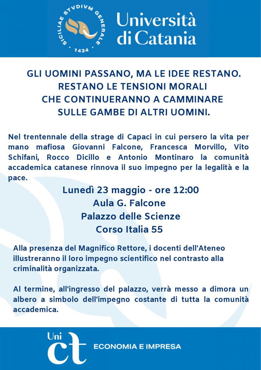 Trentennale della strage di Capaci: Evento commemorativo al DEI il 23 maggio alle ore 12:00 • Informazioni sulla strage di Capaci • ________________________________________Categoria: Eventi DEIData di Pubblicazione: Giovedì, 19 Maggio, 2022 Condividi Facebook Twitter Whatsapp Telegram Email
